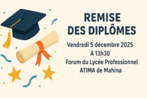 Le vendredi 05 décembre 2025 à 13h30 aura lieu la cérémonie de remise des diplômes de la session 2025 au lycée professionnel Atima de Mahina.