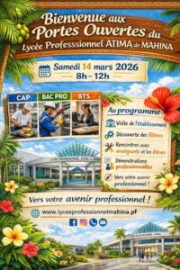 Le Lycée Professionnel de Mahina vous ouvre ses portes le Samedi 14 Mars 2026, de 8h à 12h. Venez découvrir nos formations variées. Au programme